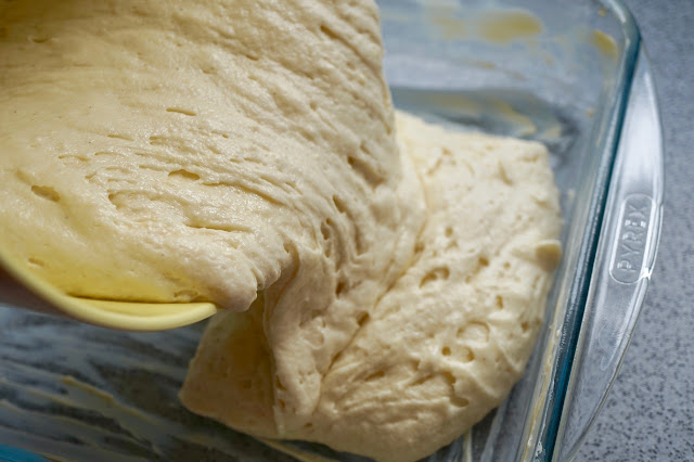 * den Teig in eine gefettete Form geben (Springform, dann wird der Kuchen hoch, ich habe diesmal meine Glasform von Pyrex* verwendet, dann wird der Kuchen etwas flacher)