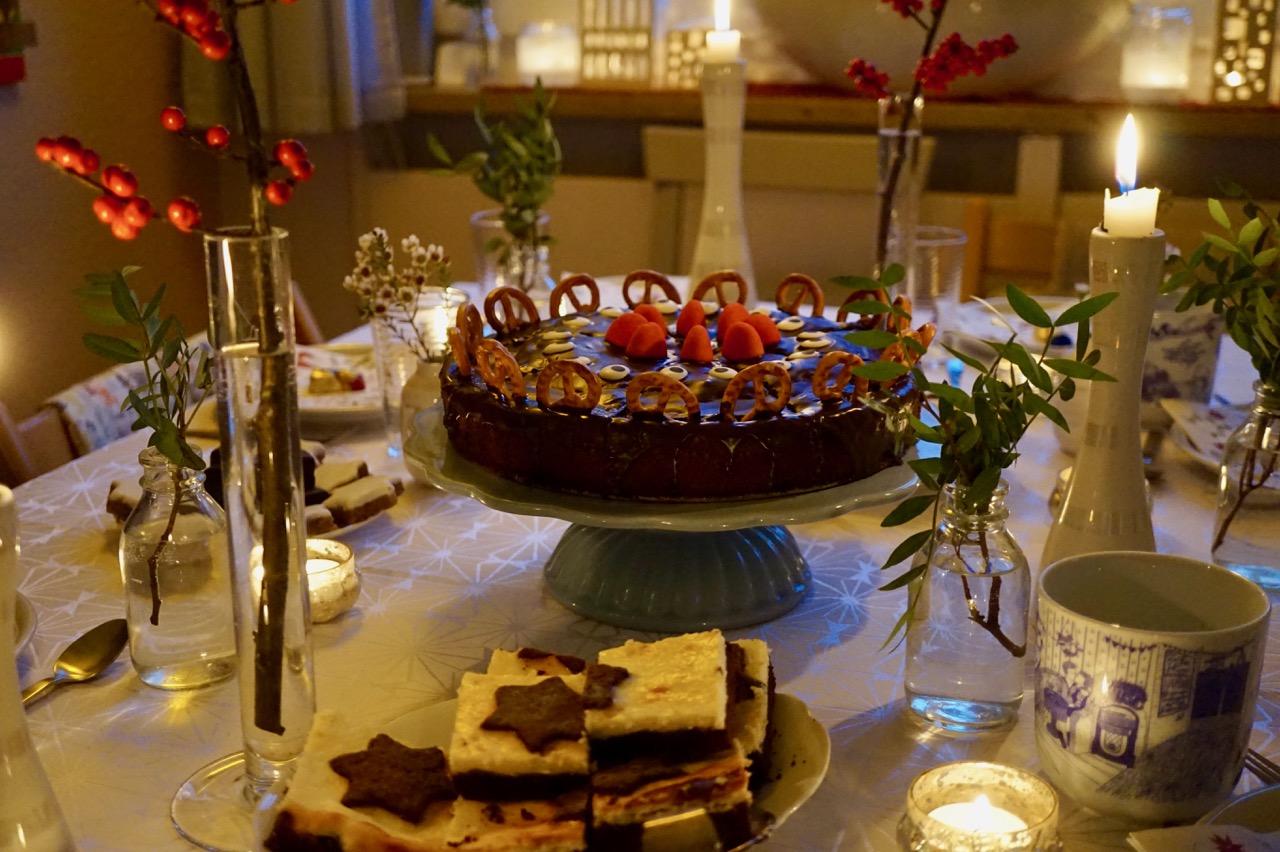 Für die Kinder habe ich eine Überraschung geplant. Diesen lustigen Kuchen habe ich irgendwo im Internet entdeckt. Ich fand ihn so süß, dass ich den unbedingt machen wollte. Als Basis backe ich den Südtiroler Schokoladenkuchen. Ich bestreiche ihn mit Kuvertüre und klebe Zuckeraugen, Schaumerdbeeren und Salzbrezeln drauf. Tadaaaaa: ich taufe ihn Rudolfkuchen!