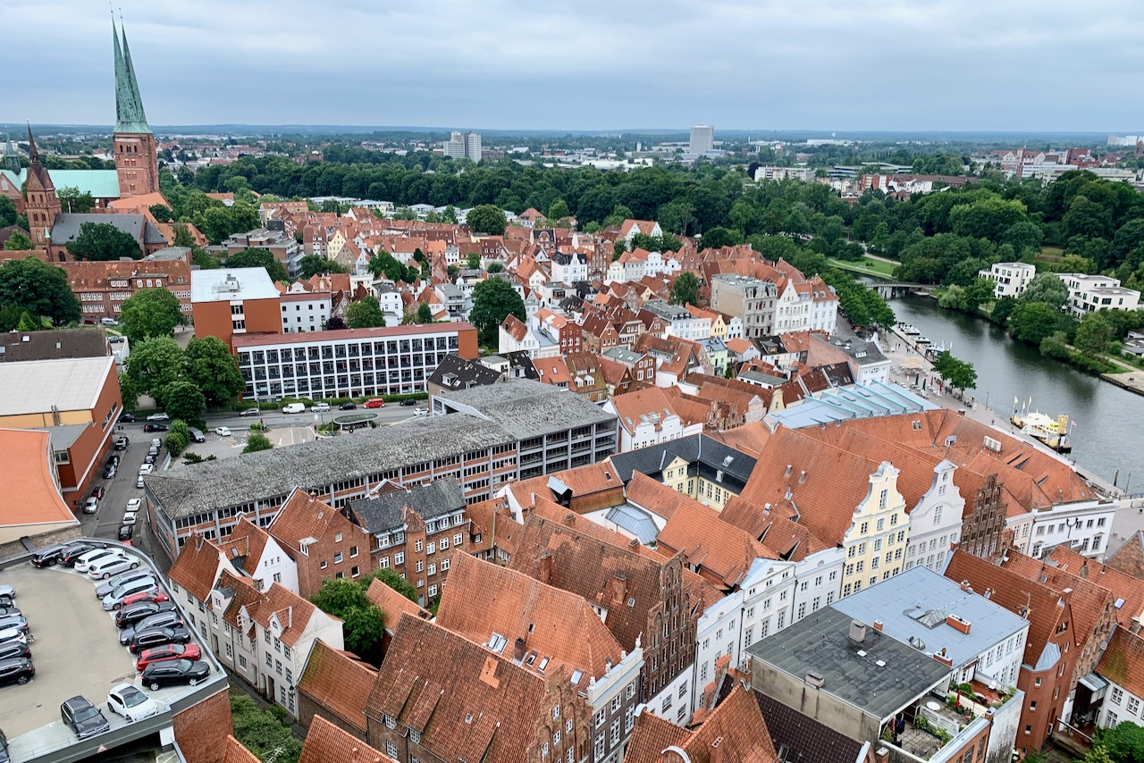 Oben auf der Aussichtsplattform ist es sehr windig. Aber der Blick über die Stadt ist wunderschön! Da ist das Holstentor, die Trave und viele, viele hübsche Stadthäuser mit ihren Hinterhöfen. Ich schaue mir eine Straße aus, die ich hinterher auf alle Fälle entlangspazieren möchte.