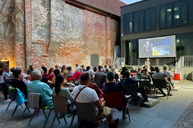 Und auch im Stadtmuseum war sehr viel los. Es fanden insgesamt vier Vorstellungen im Open-Air-Kino statt. Immer mit einem Vortrag der Mitarbeitenden, die passend zum jeweiligen Film ein Stück aus der Sammlung präsentierten. Das Wetter war am Abend durchgehend warm und trocken. Ich war an drei Abenden dabei, zwei Mal mit dem Liebsten. Und auch hier wurde es jedes Mal spät.