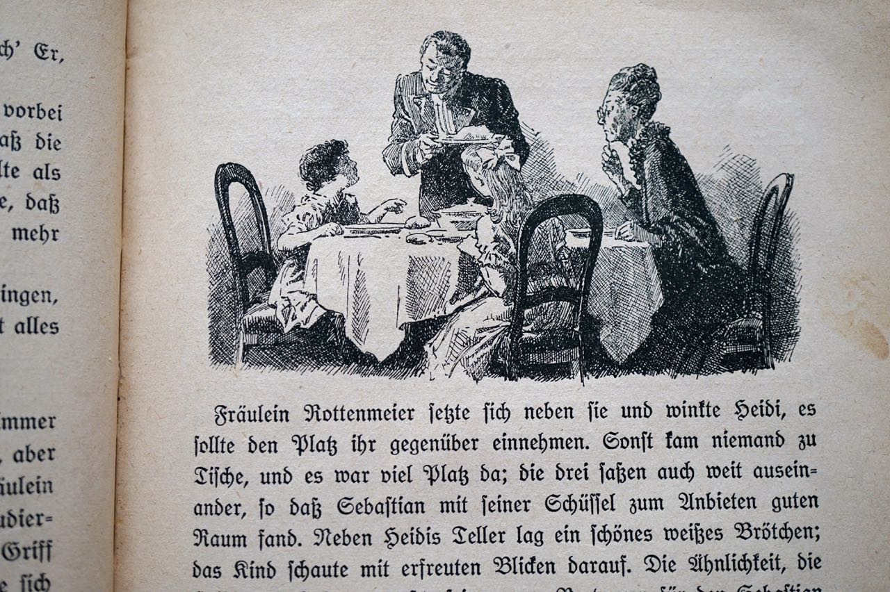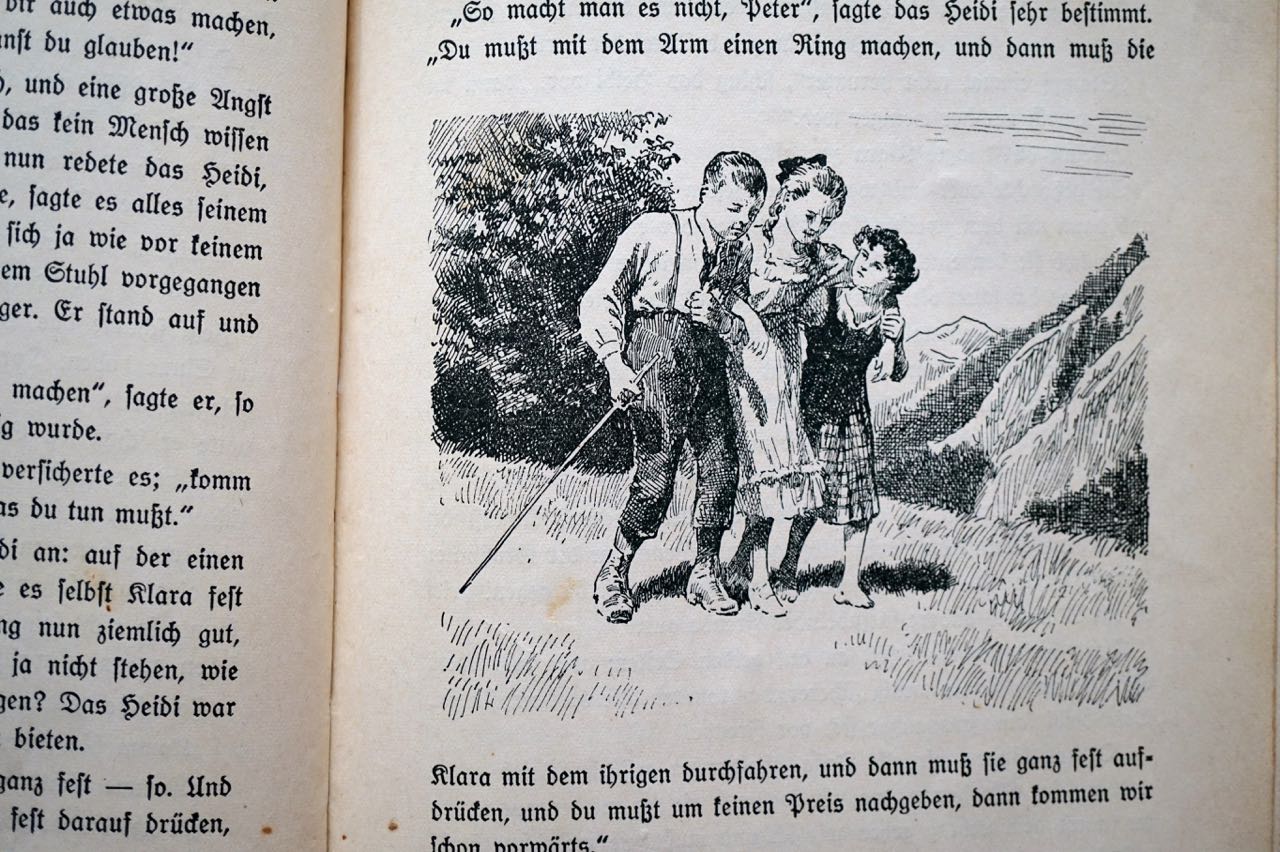 Die ganze lange und ungekürzte Geschichte von Johanna Spyri las ich mit ungefähr 10 Jahren. Meine Oma väterlicherseits schenkte mir ihre Heidi-Bücher, die sie in den 20er Jahren selbst als Kind besessen hatte. Vorne hat sie mit Bleistift in altdeutscher Schrift ihren Namen hineingeschrieben. Ich schrieb meinen dazu.